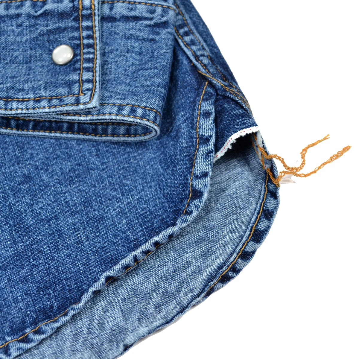 Selvedge ticker detail on sides of bottom hem and inside of placket