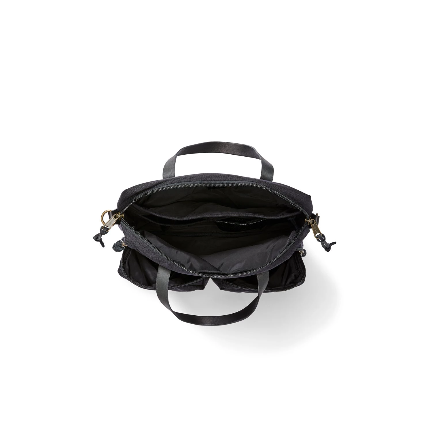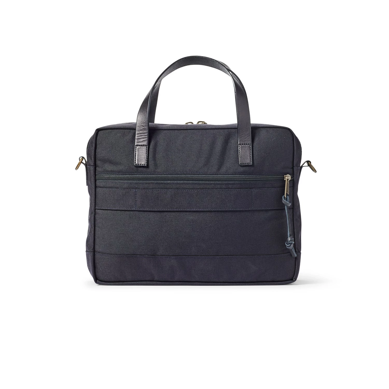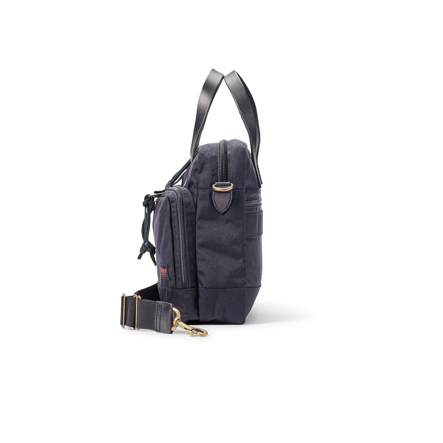 Padded ballistic nylon briefcase sized to carry a standard 15in laptop plus essentials. Trolley strap on rear slips over handles of rolling luggage. Reinforced double layer bottom for water resistence and durability. Two large exterior pockets with interior slotted patch pockets. 8.7-oz. 1000D nylon + nylon lining + Bridle Leather . Imported.