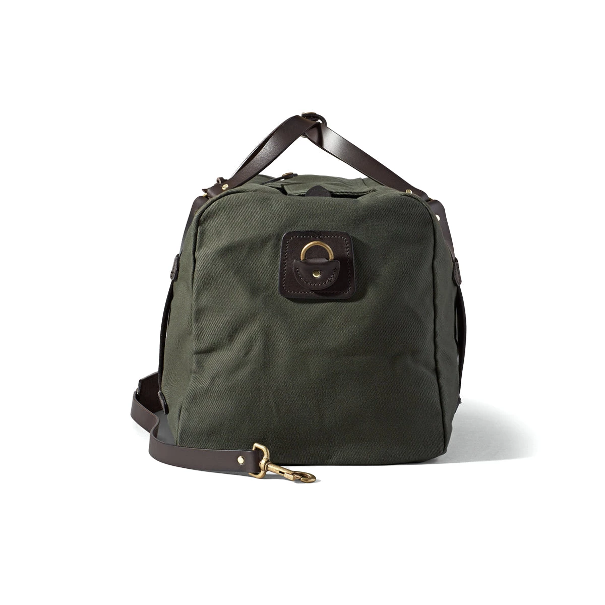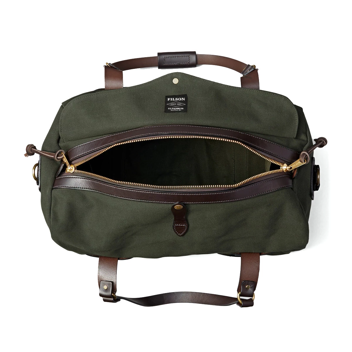 Solid brass zipper closure custom cut at Filson with storm flap for added security