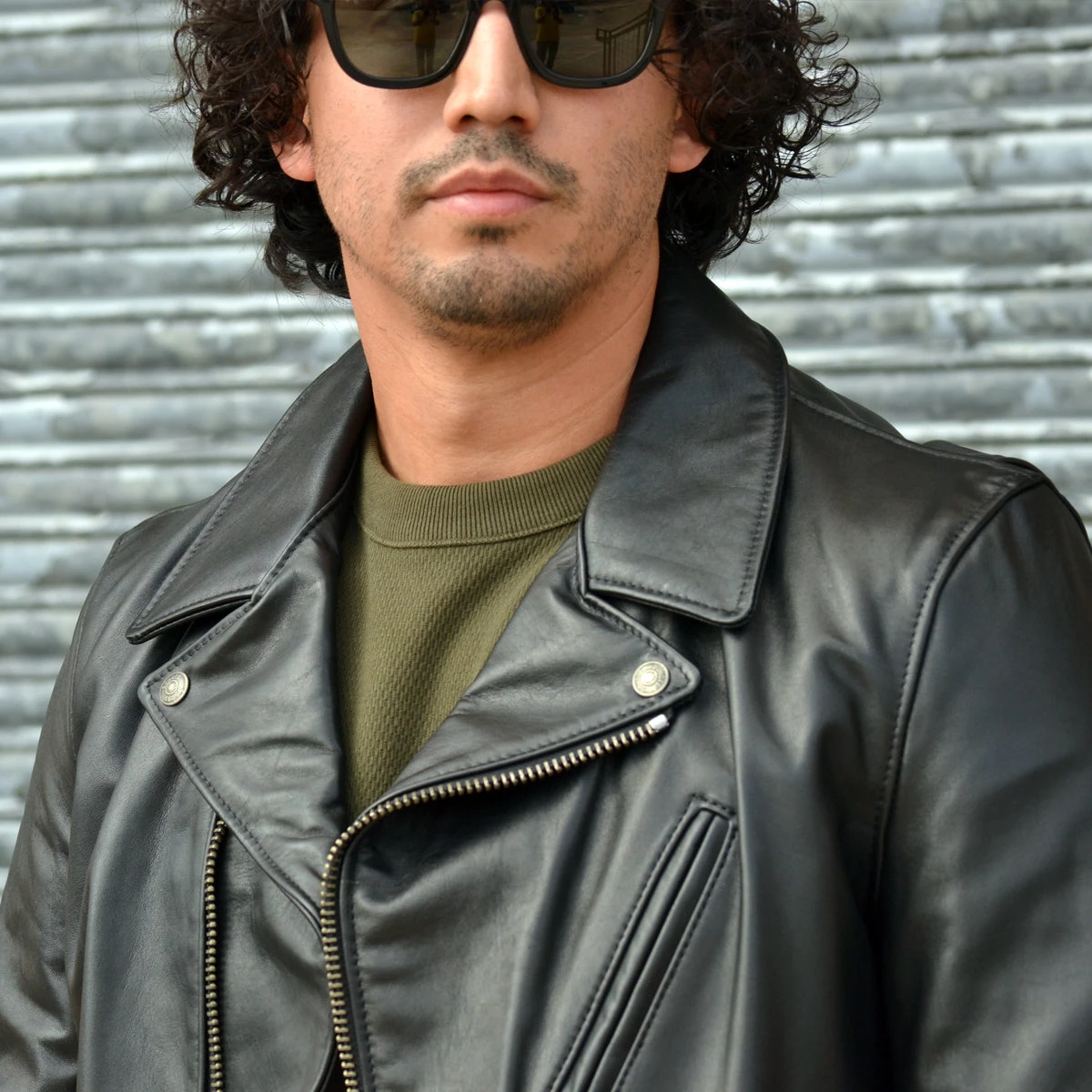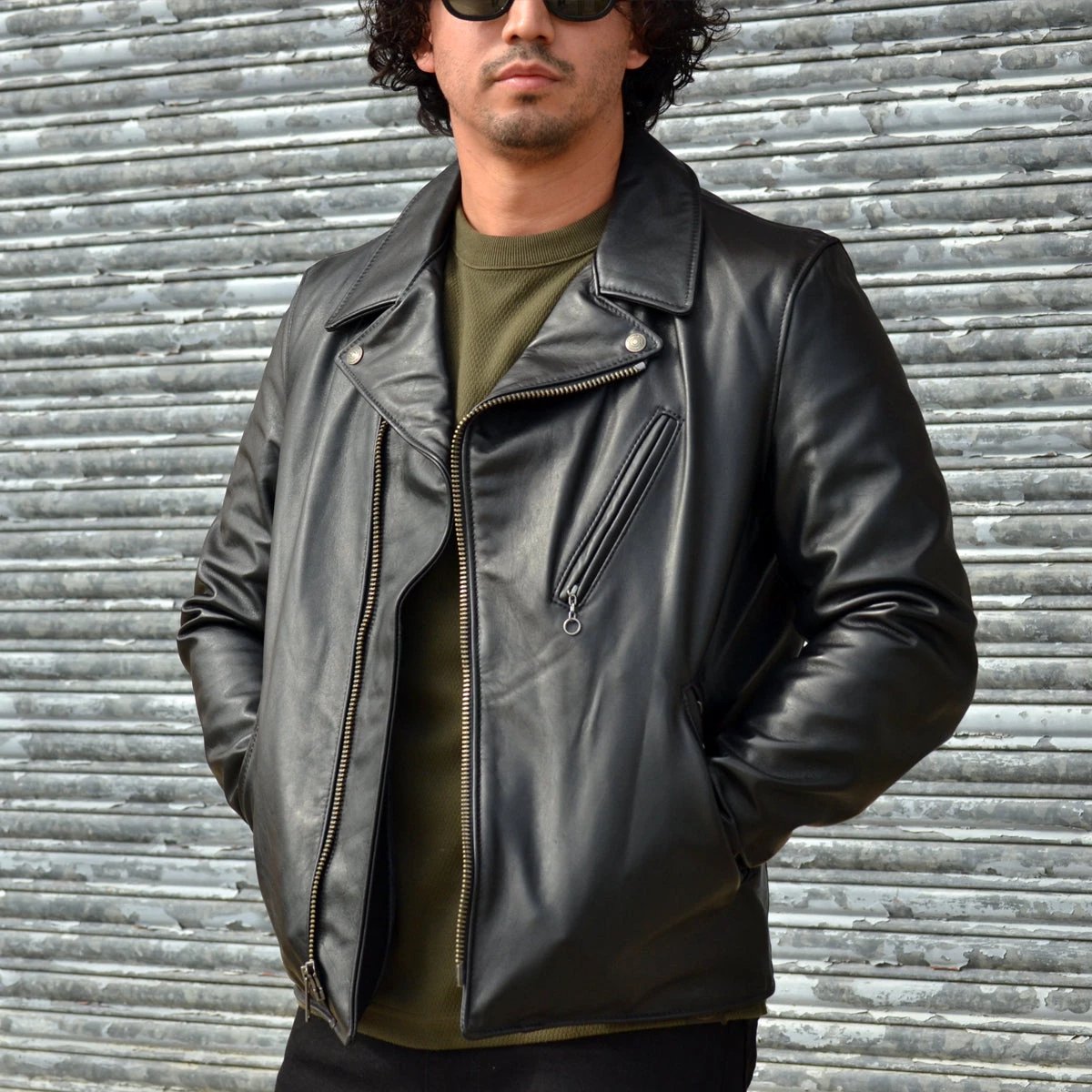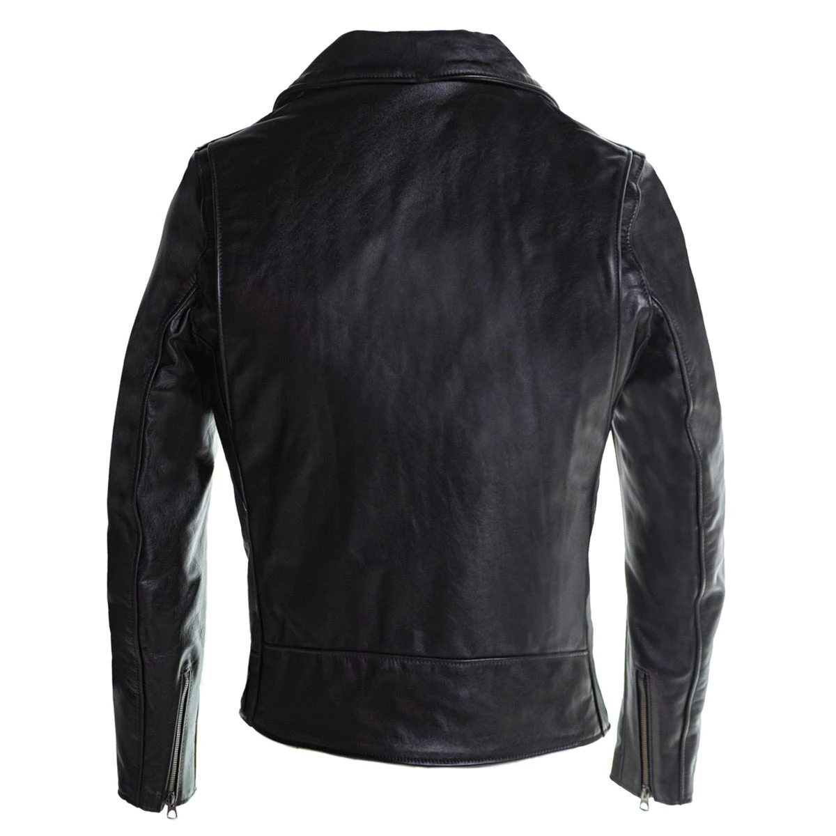 25” lightweight waxy cowhide clean motorcycle jacket features asymmetrical front zipper, logo snaps, bi swing back and poly twill Schott logo lining.